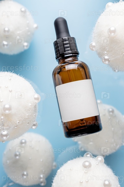 Макет стеклянной бутылки-капельницы. Флакон с черной крышкой. Концепция косметологии и красоты. Косметика зимнего сезона. Подарки на Рождество или Новый год. Пустая реклама с копией пространства