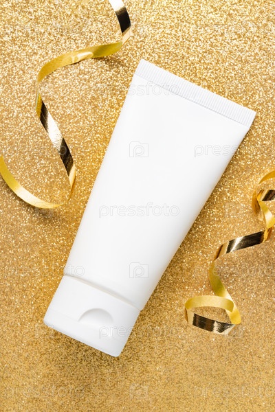 Белая нефирменная трубка с кремом для рук или маской для лица на блестящем золотом фоне. Презентация косметических процедур к праздникам в подарок