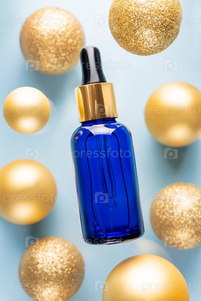 Минимальная композиция с сывороткой или маслом в синей стеклянной бутылке с капельницей на творческом фоне с золотыми рождественскими безделушками. Концепция зимнего ухода за кожей