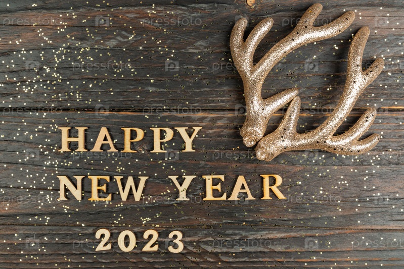 С новым годом 2023 цитата из деревянных букв и золотых оленьих рогов в качестве украшения. Праздничная открытка на рождество и новогодние праздники