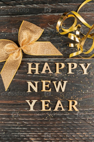 С новым годом деревянный текст, украшенный золотым бантом и серпантином на деревянном темном фоне. Праздничная открытка на новогодние праздники