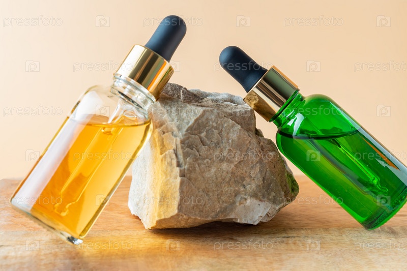 Две бутылки-капельницы с маслом для лица с витамином и коллагеном на деревянном подносе. Уход за кожей для молодой и здоровой кожи