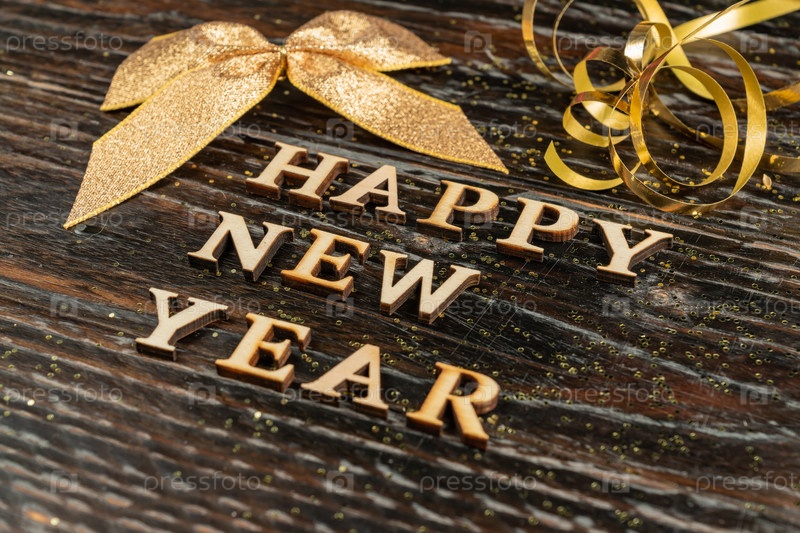 С Новым Годом. Цитата из деревянных букв на деревянном фоне, украшенная золотыми блестками, бантом и растяжками. Креативная концепция новогодней открытки