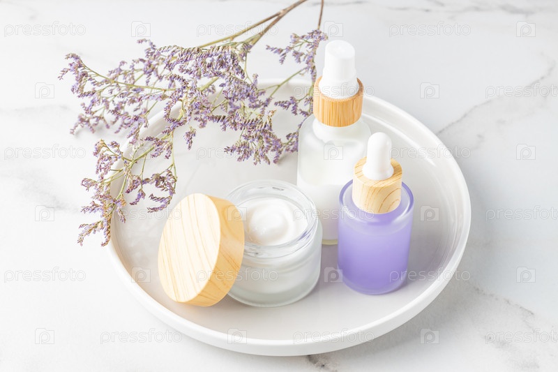Набор косметических средств на керамическом подносе. Процедура ухода за кожей в несколько этапов. Крем, сыворотка, масло в пустой матовой упаковке. Макет
