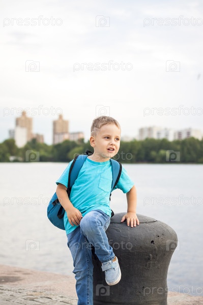 Мальчик в синей футболке с рюкзаком за спиной. Путешествие. Лицо выражает естественные радостные эмоции. Не постановочные фото с натуры