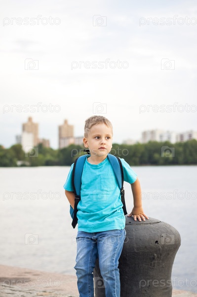 Мальчик в синей футболке с рюкзаком за спиной. Путешествие. Лицо выражает естественные радостные эмоции. Не постановочные фото с натуры