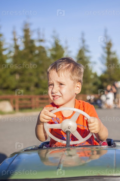 Мальчик за рулем детской машины. Радостные эмоции. Дети, портрет