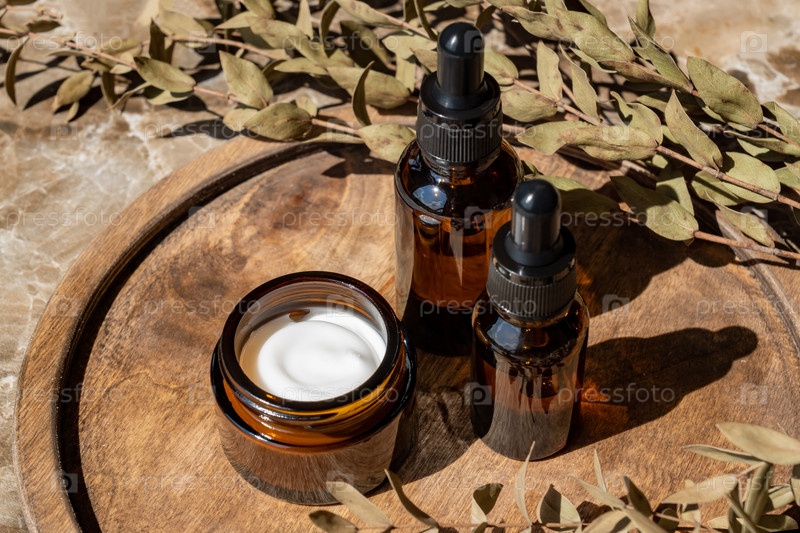 Косметические бутылки на деревянном подносе с сухой веткой эвкалипта. Эко косметика и аксессуары. Концепция натуральной косметики по уходу за кожей