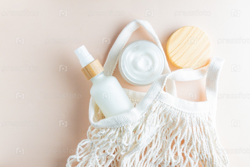 Пустая бутылка из матового стекла и бамбуковая банка на бежевом фоне с мешком из хлопчатобумажной сетки. Органический спа-косметический косметический продукт макет. Концепция нулевых отходов