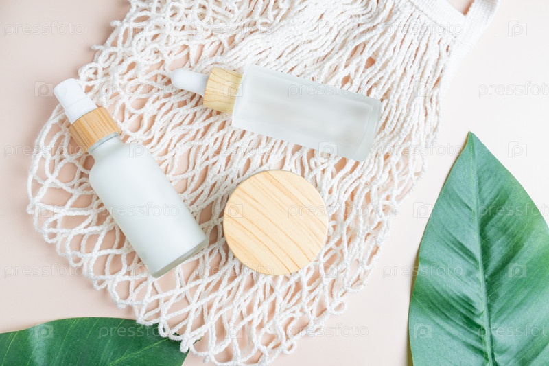 Набор косметических средств на хлопковой сетке. Коллекция косметических упаковок для крема и сыворотки для лица. Пустая этикетка естественной красоты для брендинга концепции макета