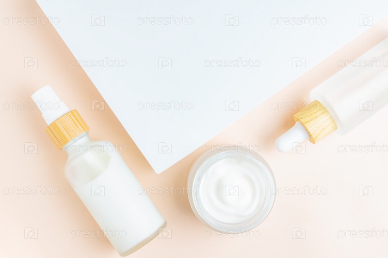 Концепция ухода за кожей. Набор косметических средств, кремов и сывороток. Бутылки из матового стекла на белом подиуме и бежевом фоне. Омоложение и увлажнение. Плоская укладка. Вид сверху