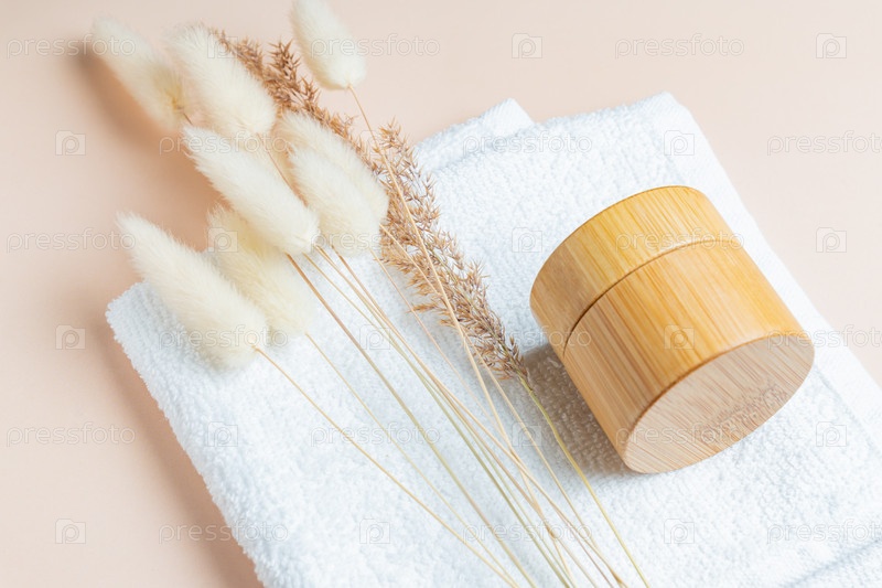 Натуральный увлажняющий или коллагеновый гель в бамбуковой банке на белом хлопке на заднем плане. спа-косметика и концепция ухода за кожей крупным планом