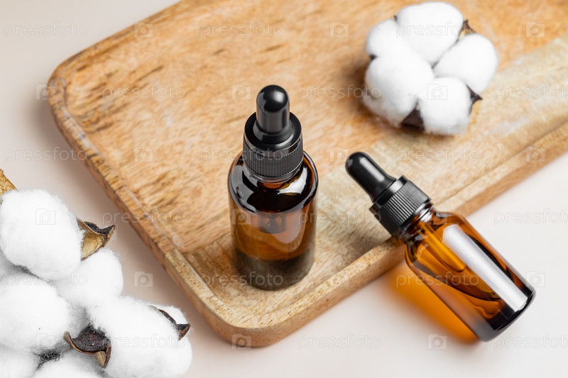 Макет бутылок-капельниц из темного янтарного стекла. Дизайн упаковки натуральных органических эфирных масел. сухие цветы хлопка и бежевый фон и деревянный поднос