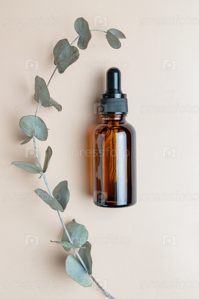 Эфирное масло эвкалипта, листья эвкалипта на бежевом фоне. Натуральная, органическая косметика. Лекарственное растение. Натуральные сыворотки. Плоская планировка, вид сверху