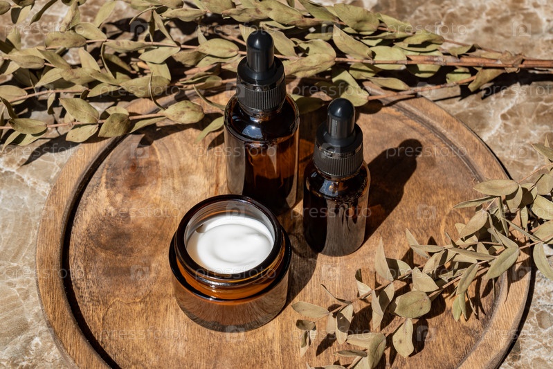 Антивозрастная коллагеновая сыворотка для лица в бутылке из темного стекла и крем для лица на деревянном круглом подносе с букетом сухого эвкалипта. Концепция натуральной органической косметики