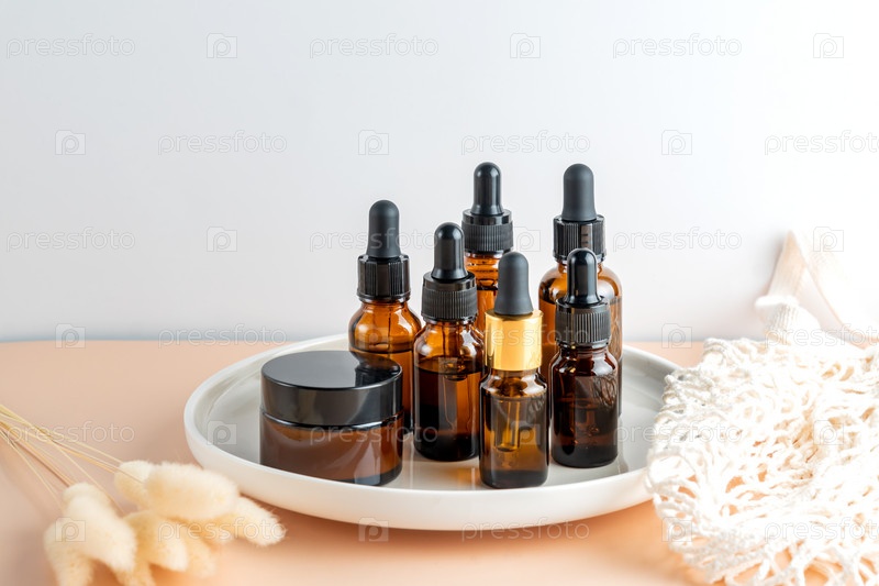 Набор косметических флаконов из янтарного стекла на керамическом подносе. флакон-капельница и баночка с кремом. Дизайн упаковки косметических средств по уходу за кожей для повседневной жизни