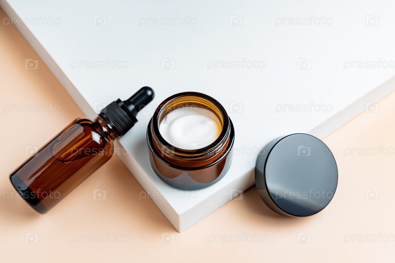 Естественная косметика в упаковке из янтарного стекла на белом фоне. Набор органических косметических средств SPA. Концепция ухода за кожей