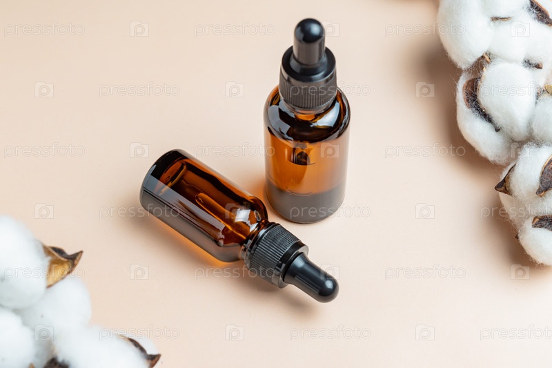 Натуральное эфирное масло, сыворотка в бутылках из коричневого стекла на бежевом фоне с хлопковыми цветами. Альтернативная медицина, ароматический травяной косметический продукт по уходу за кожей