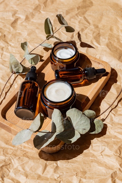 Антивозрастная коллагеновая сыворотка для лица в бутылке из темного стекла и крем для лица на деревянном подносе на фоне крафт-бумаги с веткой эвкалипта. Натуральная органическая косметика
