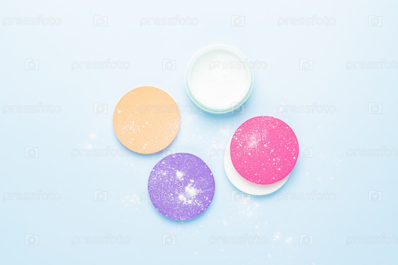 Минеральная пудра и косметические губки на синем фоне. Здоровая матовая кожа. Концепция макияжа