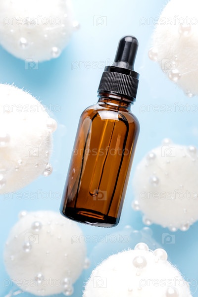 Масло для лица «Подарок красоты» с натуральным эфирным маслом, гиалуроном, витамином С, украшенное праздничными белыми сверкающими безделушками на голубом фоне. Левитация