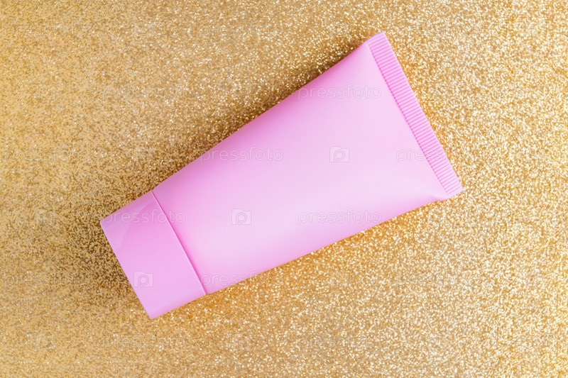 Розовая пластиковая кремовая трубка для брендинга на фоне золотого блеска. Макет косметики