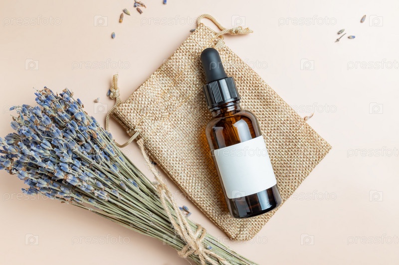 Вид сверху на бутылку-капельницу из темного стекла с ароматическим эфирным маслом или экстрактом лаванды на бежевом фоне. Пучок ароматной сухой лаванды. Косметика по уходу за кожей и телом, ароматерапия