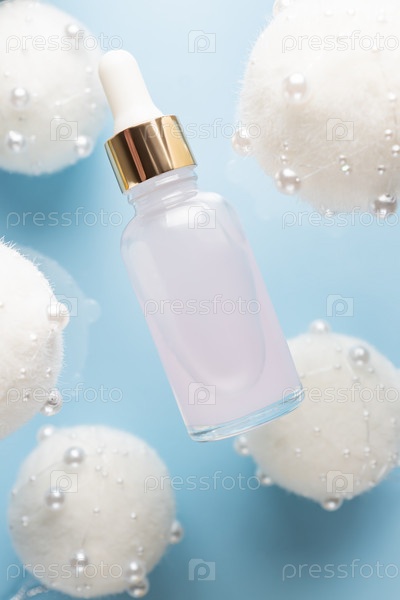 Рождественская минималистичная композиция с бутылкой сыворотки из коричневого стекла на синем фоне с летающими золотыми елочными шарами. Концепция здоровья и красоты