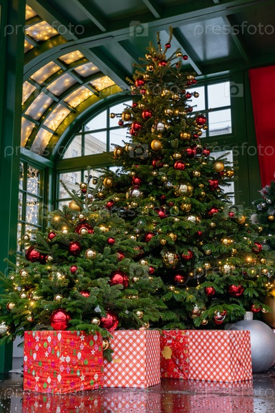 Рождественские и новогодние праздники фон. Рождественская елка с гирляндой и подарочными коробками под ней. Украшение интерьера дома