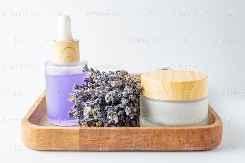 Лавандовые масла, сыворотка, сливки и цветы лаванды на деревянном подносе. Косметические средства по уходу за кожей. Набор натуральных спа-косметических средств. Эфирное масло лаванды, сыворотка, масло для тела, массажное масло, жидкость