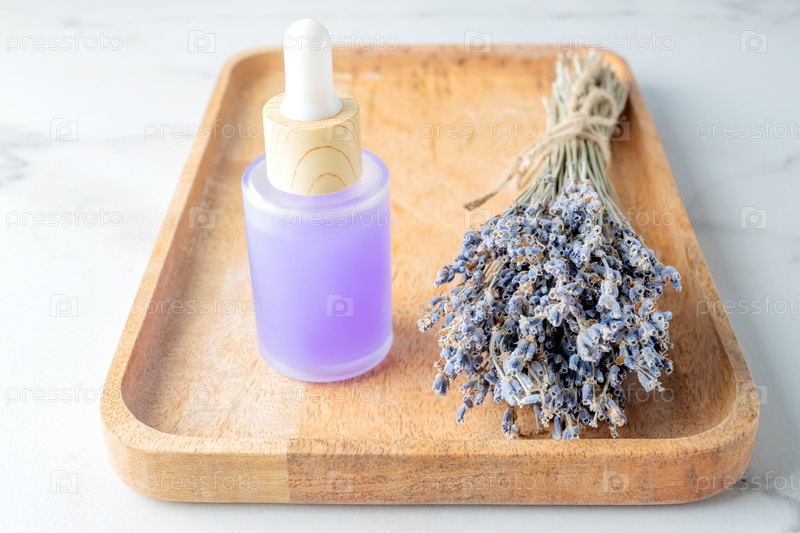 Букет травяной эссенции и цветов лаванды на деревянном подносе. Альтернативная домашняя медицина. Выборочный фокус