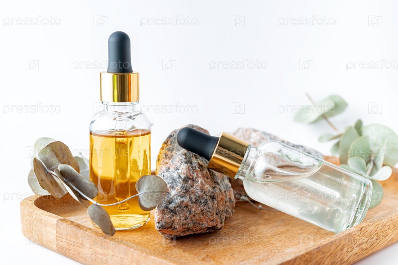 Две стеклянные бутылки-капельницы с пипеткой с черным и золотым резиновым наконечником на деревянном подносе с камнем и размытым эвкалиптом. Концепция кожи природы. Органическая спа-косметика. Модная концепция