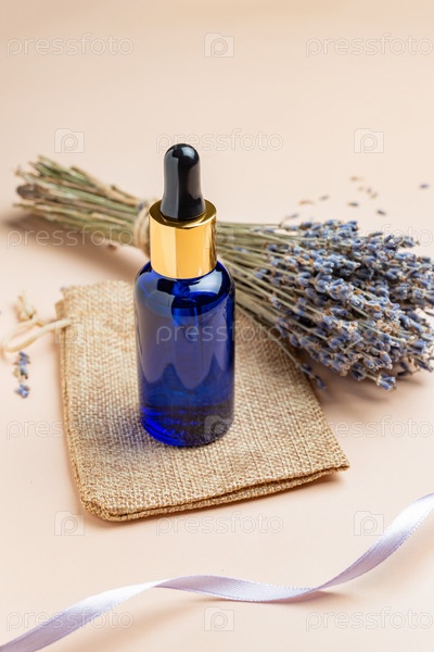 Лавандовое масло или сыворотка и цветы лаванды на бежевом фоне. Косметические средства по уходу за кожей. Набор натуральных спа-косметических средств. Эфирное масло лаванды, сыворотка, массажное масло, жидкость. Макет