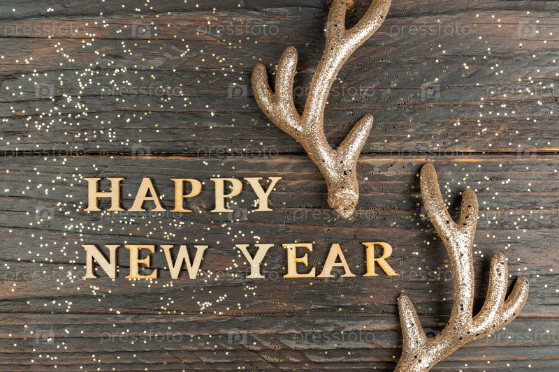 Поздравительная открытка с новым годом с деревянным текстом и золотыми рогами оленя. Праздничный фон