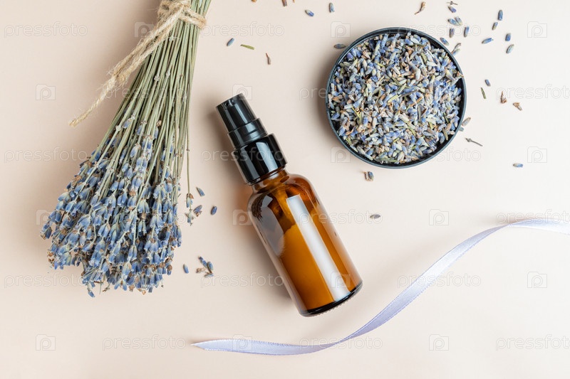 Крем в стеклянной бутылке для ухода за кожей и цветы лаванды на пастельно-бежевом фоне. Концепция натуральных косметических продуктов. Вид сверху. Плоская укладка. Концепция натуральной косметики