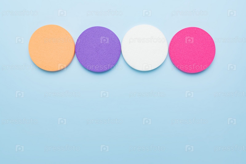 Макияж модный фон с копией пространства. Набор разноцветных круглых косметических спонжей для жидкой основы или компактной пудры. Визаж кожи лица, аксессуар для макияжа