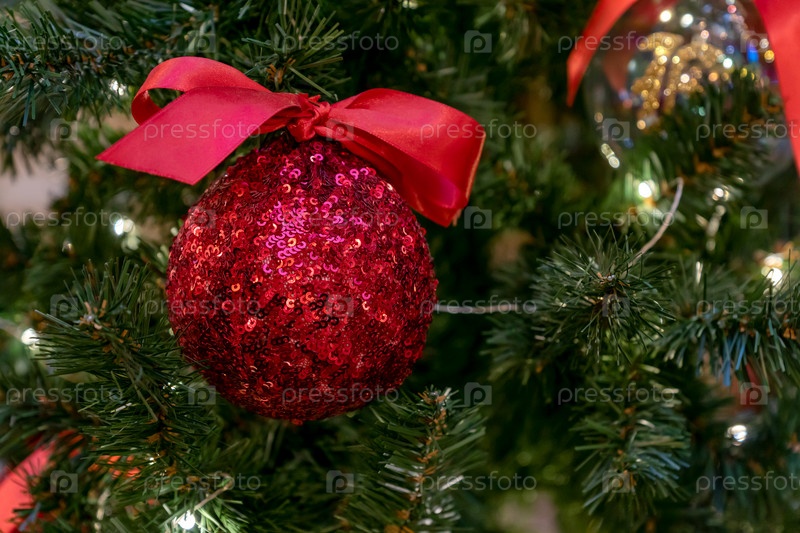 Красные блестки рождественская безделушка на дереве. Праздничная открытка для празднования зимы
