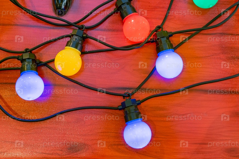 Гарламд лампочки на деревянном фоне. Место для вашего сообщения. Праздничная открытка