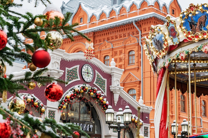 Москва, Россия - 15 декабря 2021 года: Манежная площадь украшена Рождеством и карусели. Многие елки на фоне Красной площади