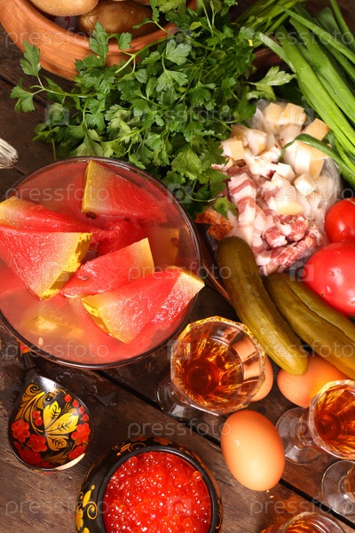 Праздничный деревенский стол с самогоном, вымоченными арбузами, икрой и блинчиками