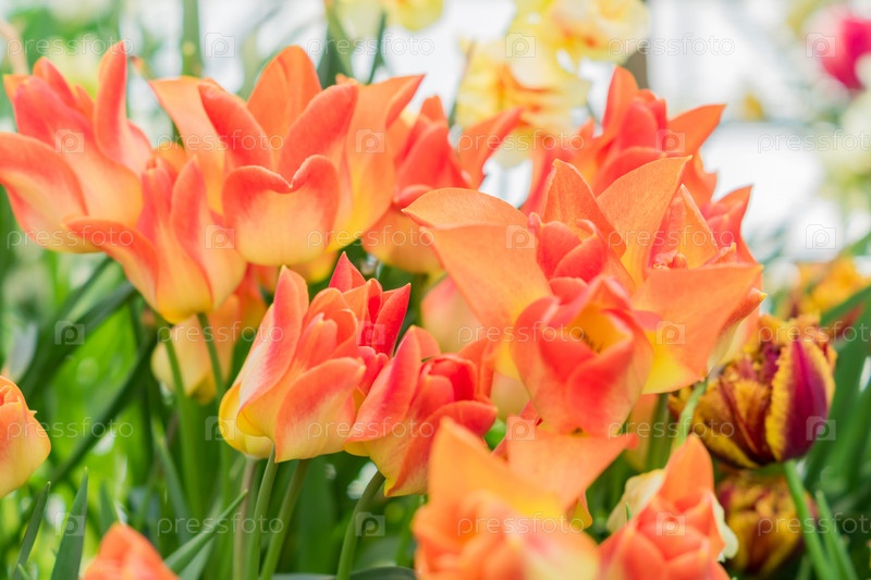 Свежее красочное поле красных тюльпанов, цветочный фон