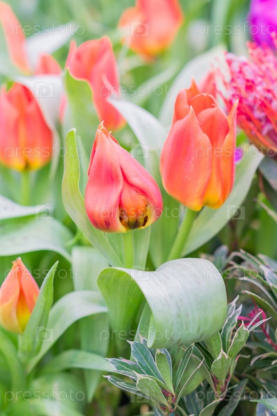 Крупным планом красные тюльпаны и пинг протея в весеннем саду