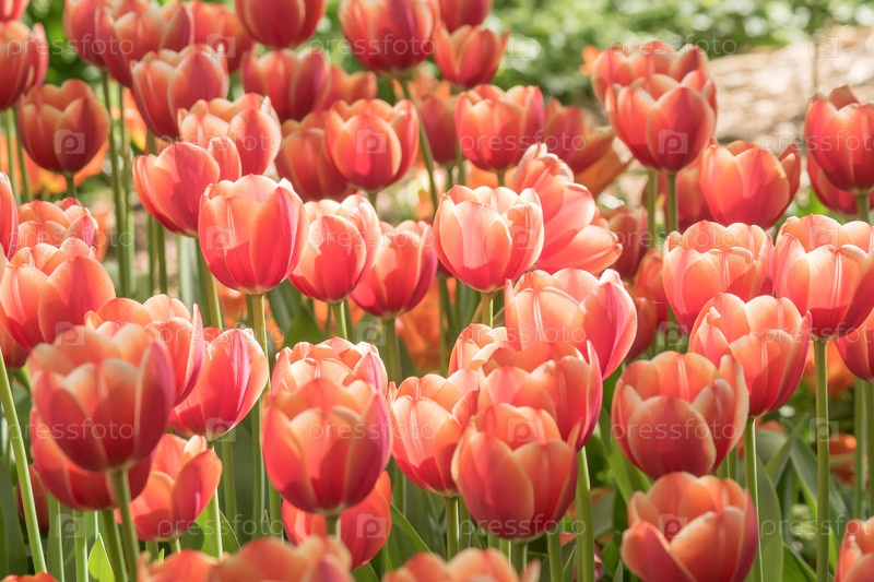 Свежее красочное поле красных тюльпанов, цветочный фон