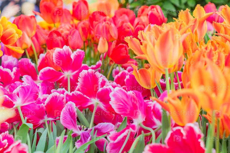 Поле цветущих красочных тюльпанов, весенние цветы в саду