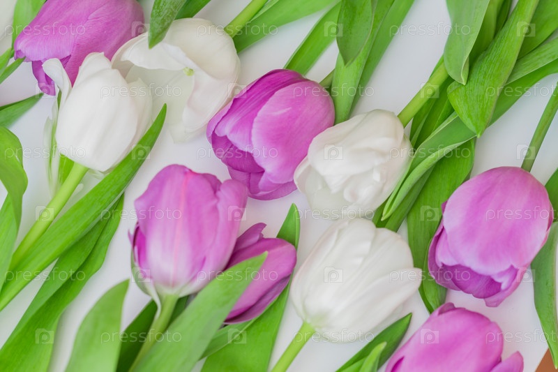 Белые и фиолетовые цветущие тюльпаны. цветочный фон