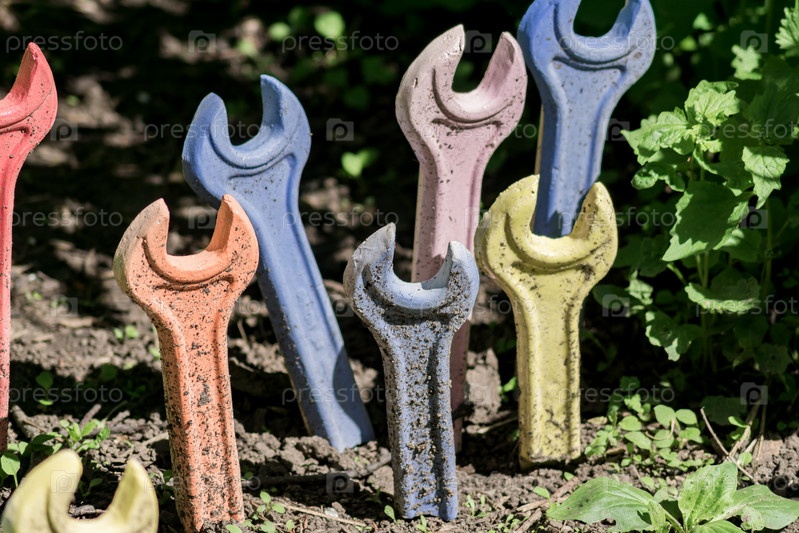 Разноцветные ключи растут из почвы в саду. Концепция новой жизни