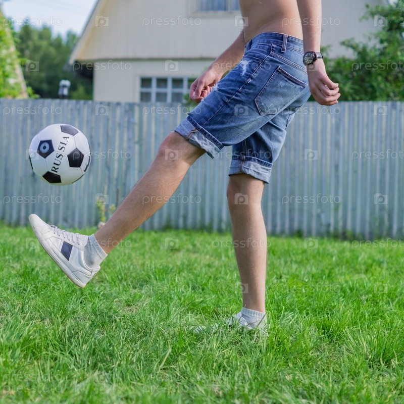 Молодой человек в джинсовых джинсах и белых кроссовках играет в футбольный мяч на открытом воздухе. Футболист-любитель чеканит мяч