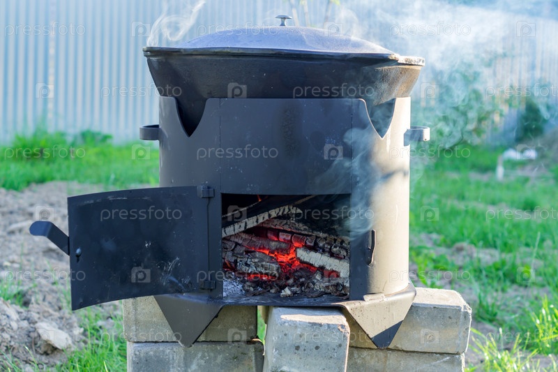 Большой металлический котел на передвижной печи на открытом воздухе