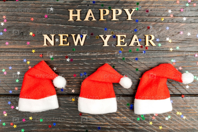 Праздничная открытка на счастливый новый год с деревянным текстом и красными Санта-Клаусами на деревянном фоне