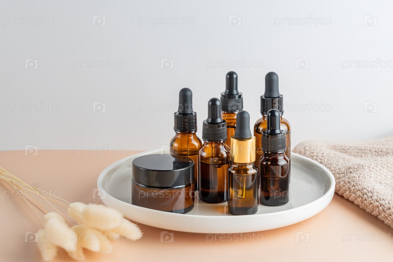 Набор натуральной косметики для ухода за кожей против старения на керамической тарелке с сухой тростью лагурус.Косметическое масло для лица, эфирное масло и крем для лица в небрендовой упаковке из темного стекла